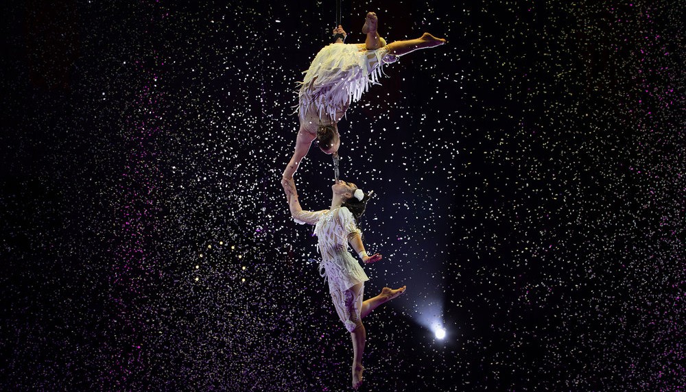 • Воздушные гимнасты на ремнях Виктор Катунин и Диана Петрова.